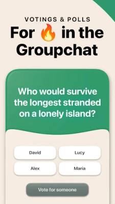 Spice up your group chats with AskUs, the ultimate friend-poll app! Answer thought-provoking daily questions or polls about your friends, then vote and see the results for endless entertainment. Perfect for groups of 3 or more. Connect, laugh, and bond over newfound insights into each other's personalities and quirks.