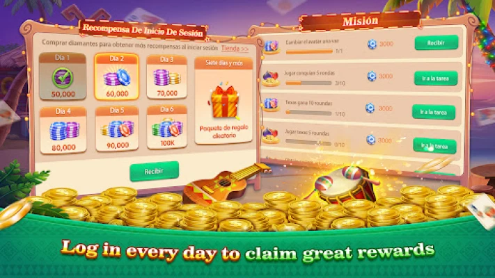 1. Login every day to receive login rewards, novice rewards, online rewards, and each mission to get a lot of chips.
