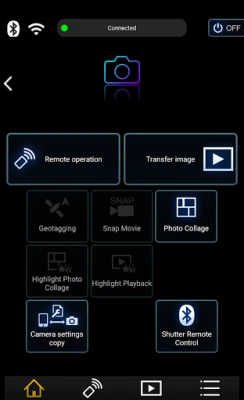 ・This app allows you to implement continuous connection with a digital camera that has Bluetooth function and make Wi-Fi connections and perform remote operation just with your smart phone. It also allows you to apply location information to recorded images and easily perform automatic transfer of images.(*4)